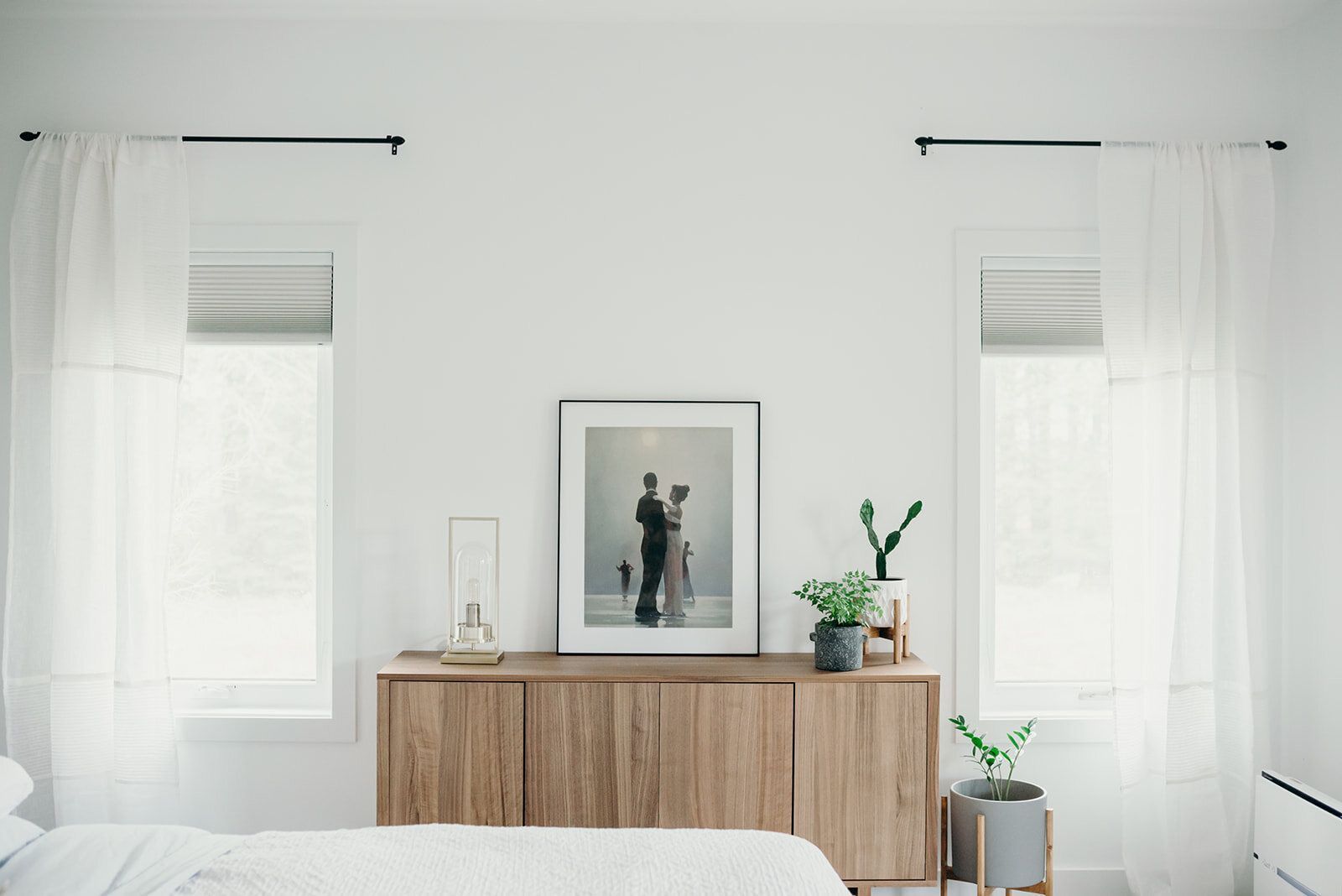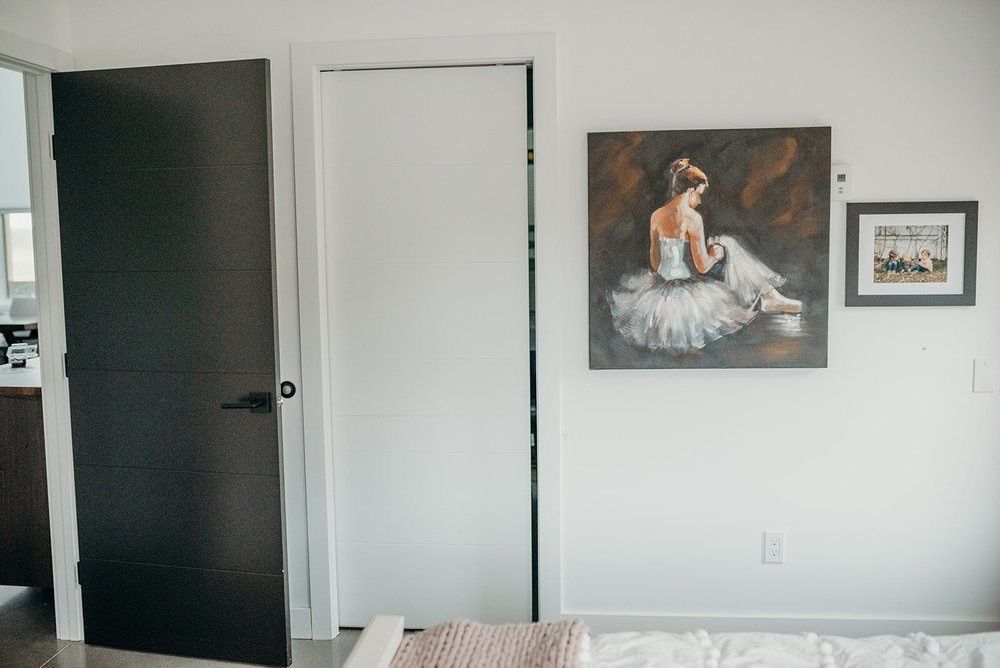 The master bedroom is not 100% complete, but until it is, I wanted to help create a room that is still relaxing and inviting. There was one specific meaningful art piece that the couple had, that I wanted to incorporate into their bedroom. Because it looked outdated, we had the old frame taken off and replaced by a super slim, modern style black frame. It completely elevated and remade the art piece. The colours I used in the bedroom were drawn from this piece, and added in soft blues, pinks, and golds. Along with some warm woods, plants, and white linens, the bedroom is now looking like a pretty place to retreat.