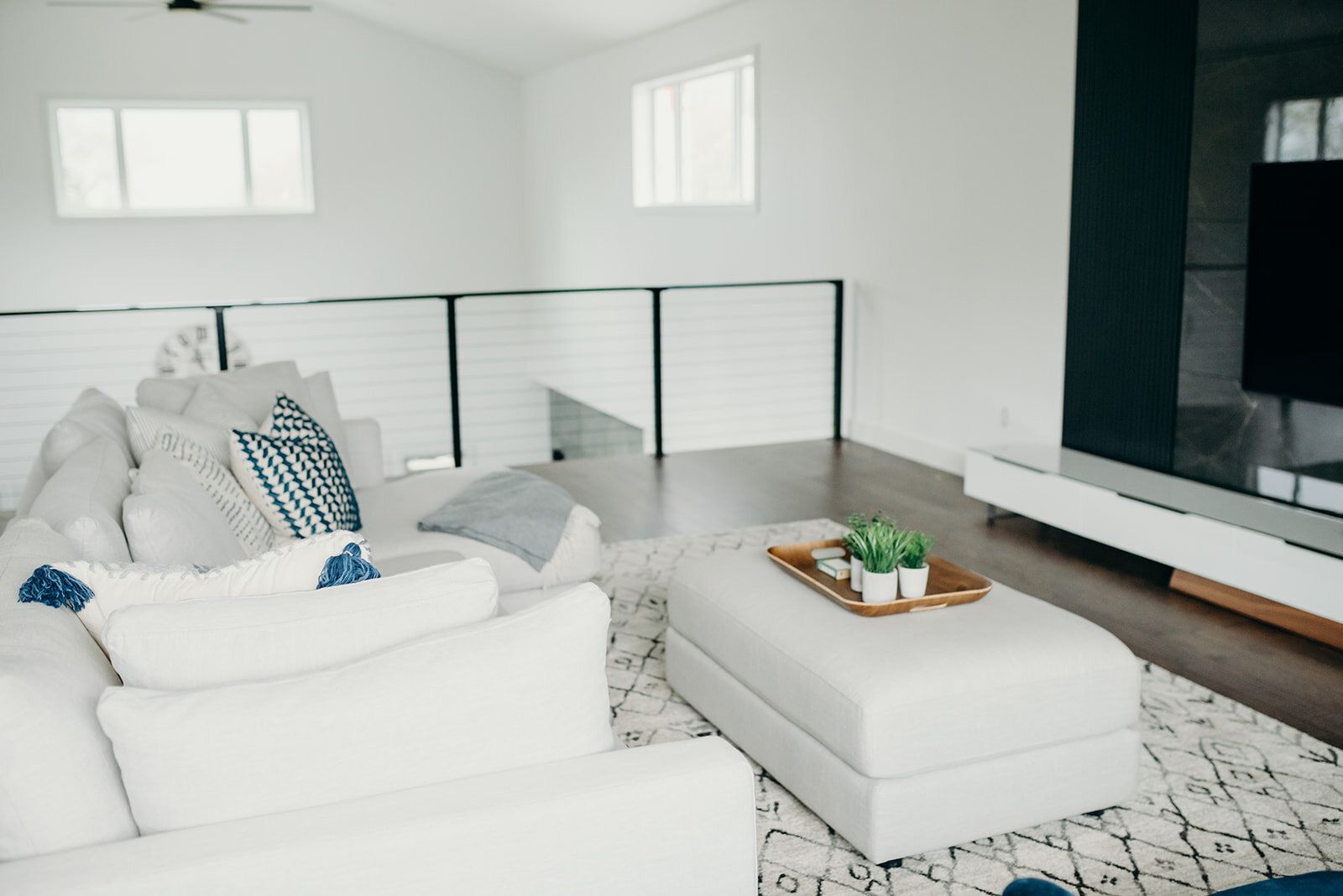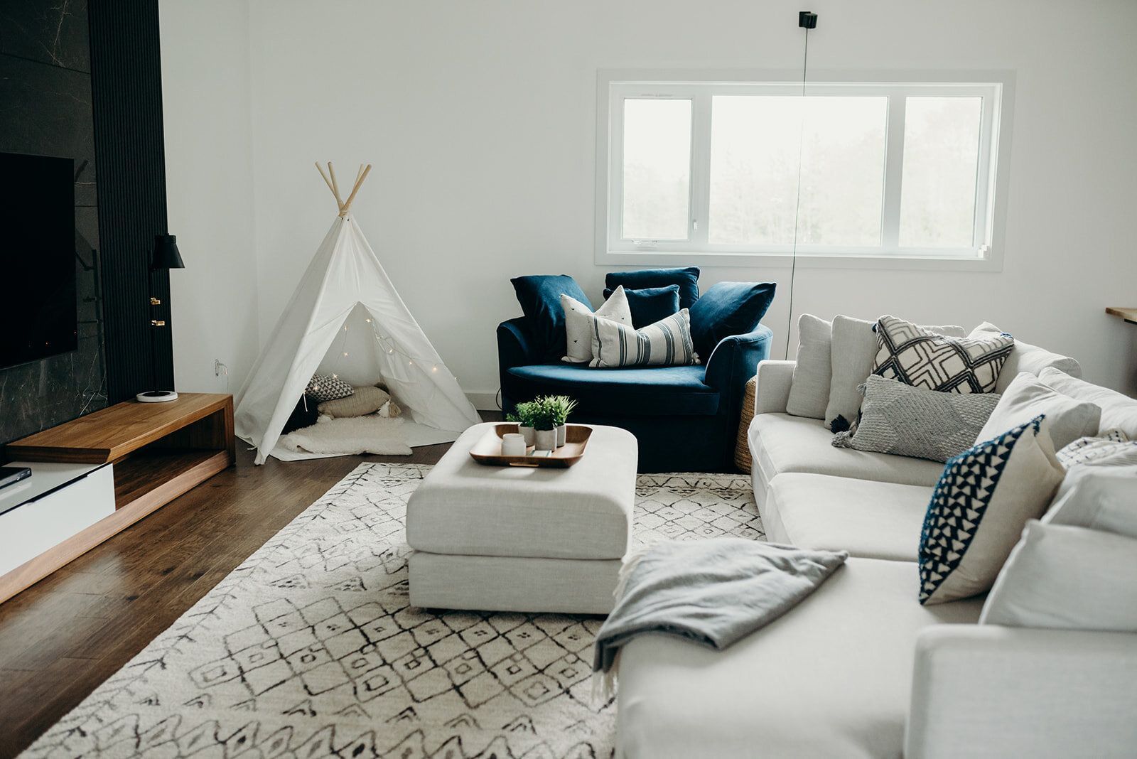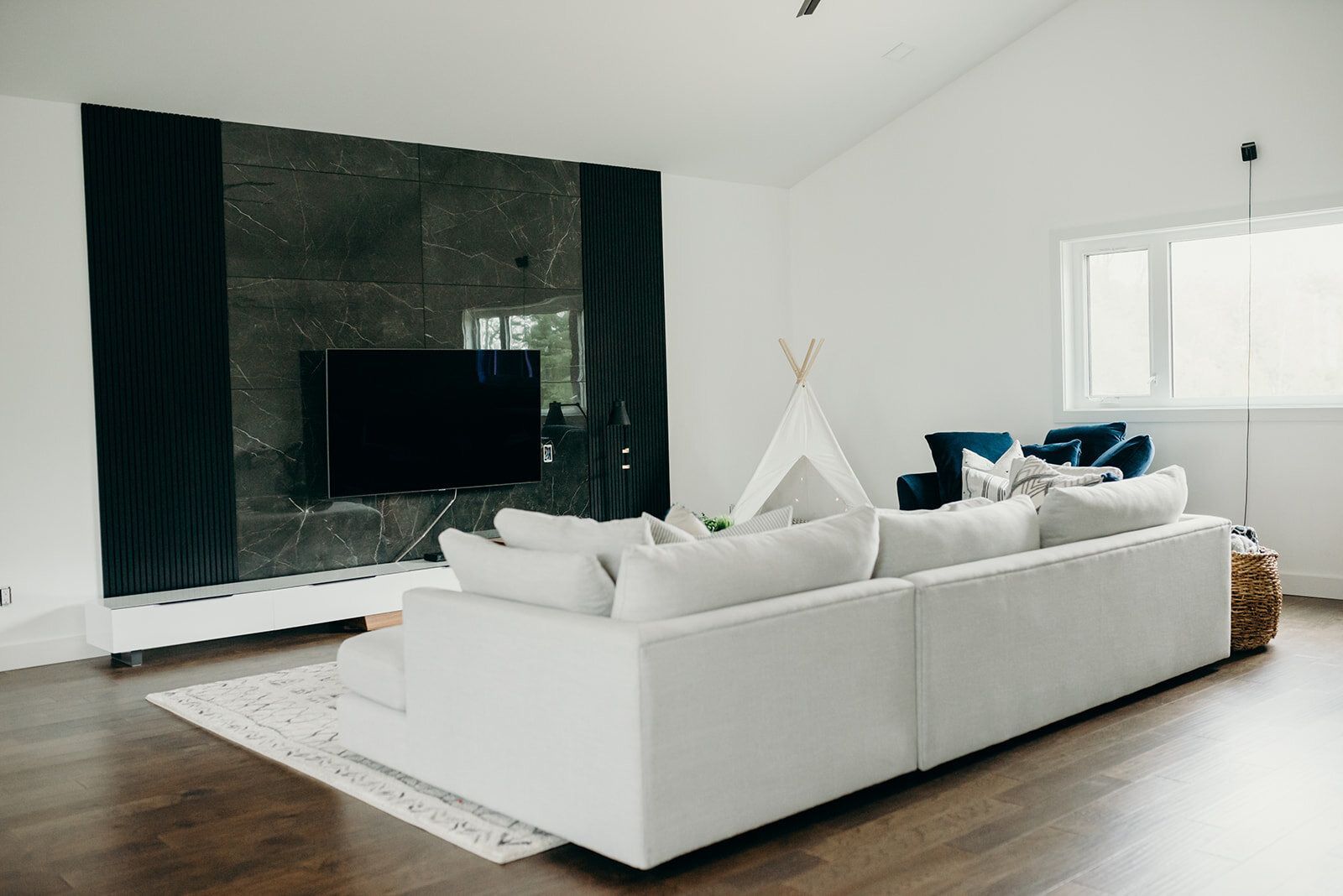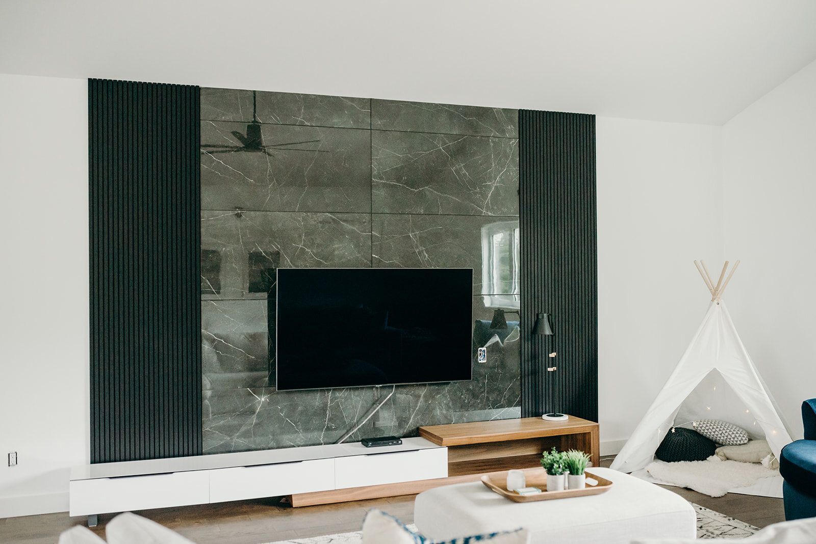 When I first met with our clients, the loft space was completely unfinished. They knew they wanted this space to be their main living room and entertainment area. The trick was incorporating some type of focal point that would shine past the TV. Pulling from the modern and industrial feel of the home, we incorporated black marble veined tile, outlined with black slats. We chose a slim, modern TV console that fits perfectly underneath, and offers storage for all the extras needed. We added in cozy elements with an extra deep sofa, cuddle chair, cushions, plush rug, and a fun teepee tent for the kids to lounge in.
