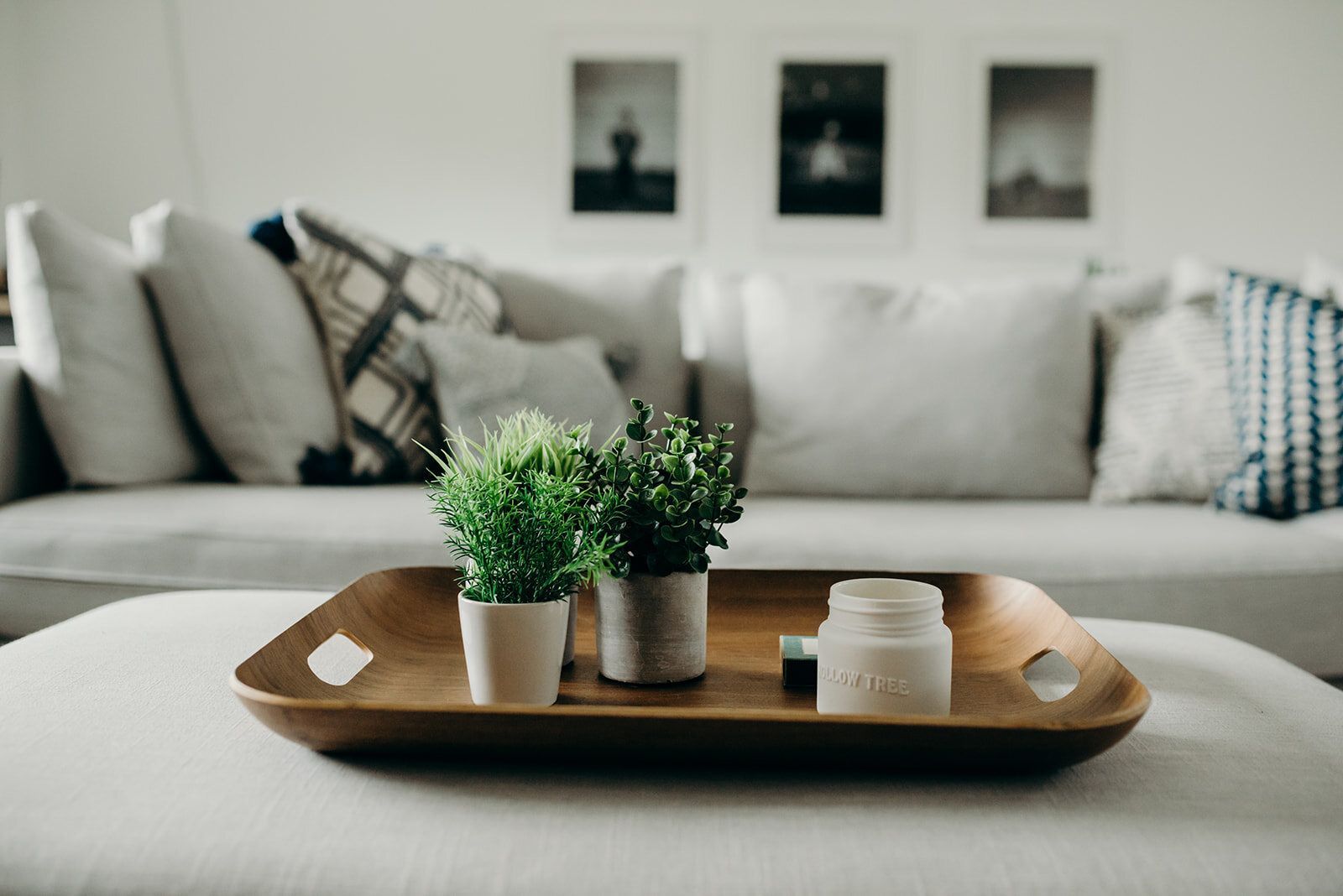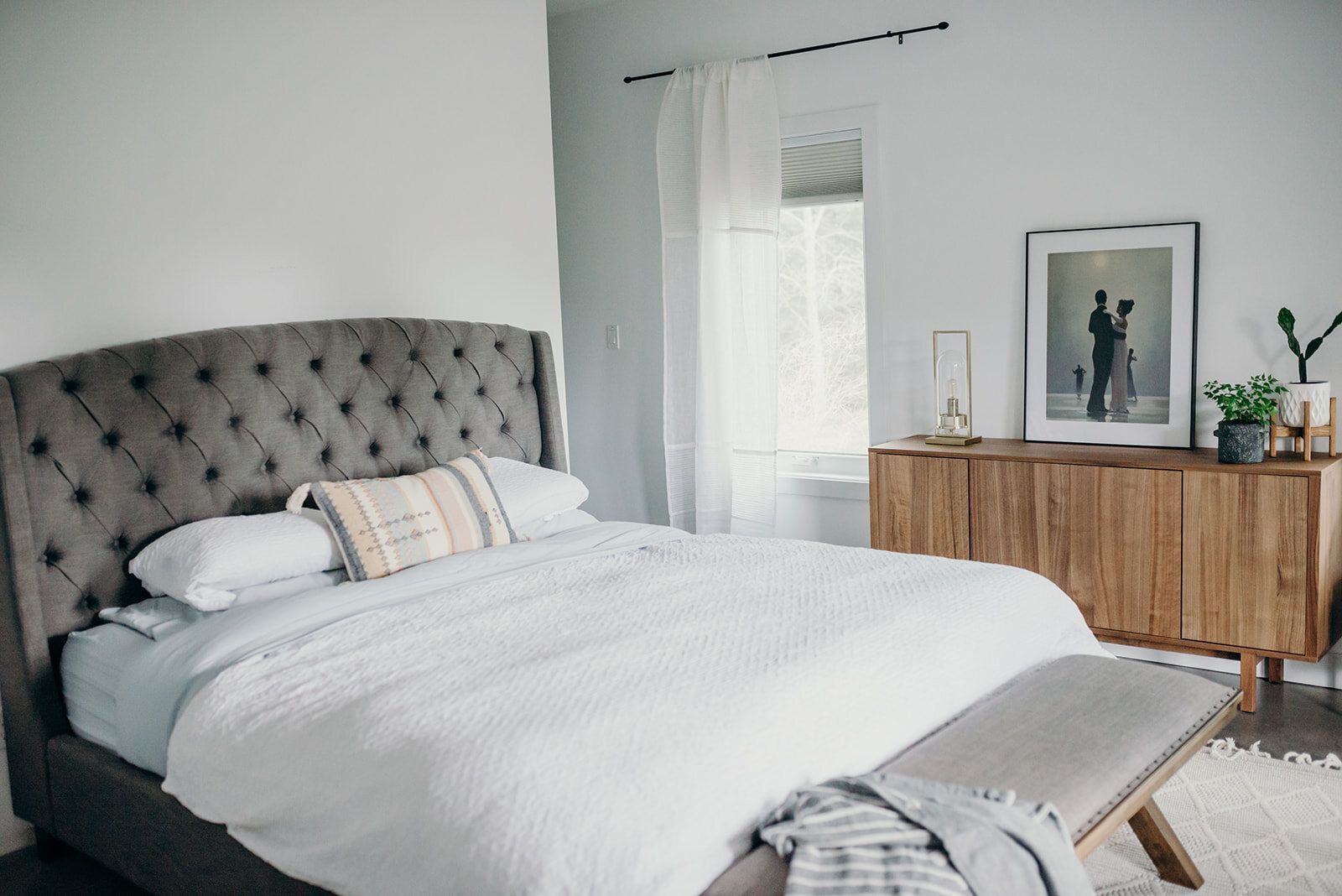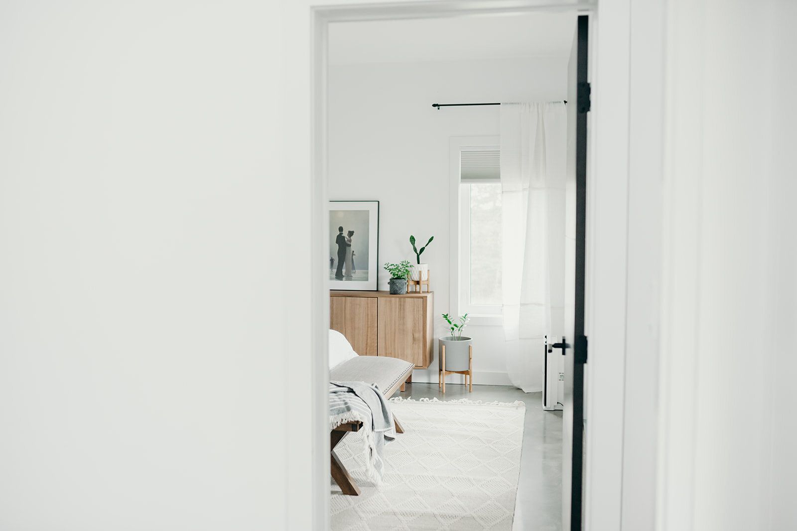Rug & Cushion: Liliidae Home & Design / Sideboard: Ikea / Light: Homesense / White Pot & Stand: The PotStand Company / Dark Grey Planter & Throw Blanket: Mel-City / Reframed Art: Northern Lights Gallery / Bench: Urban Barn