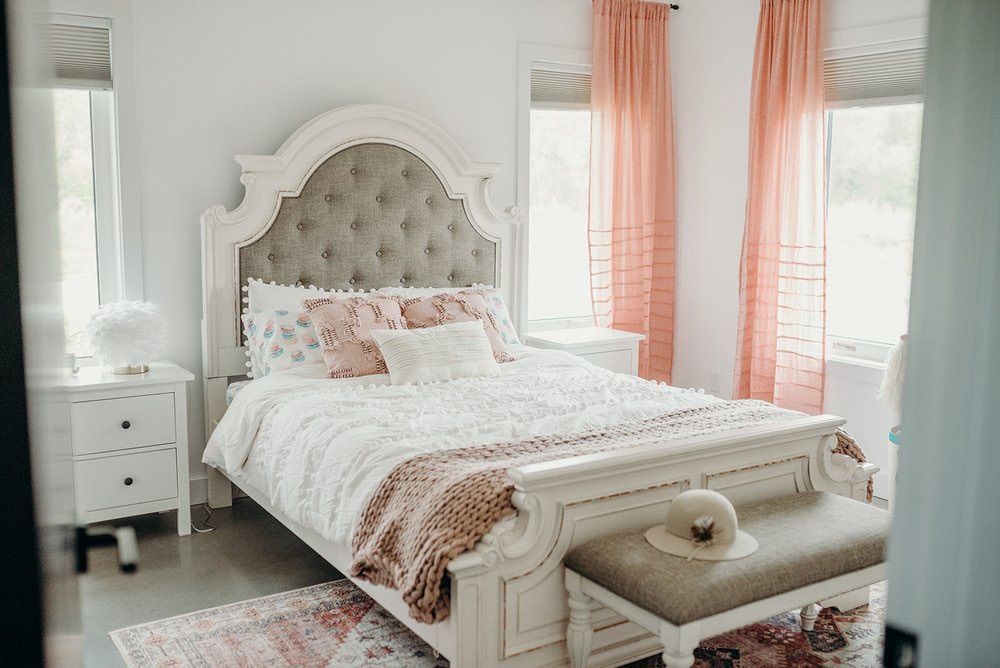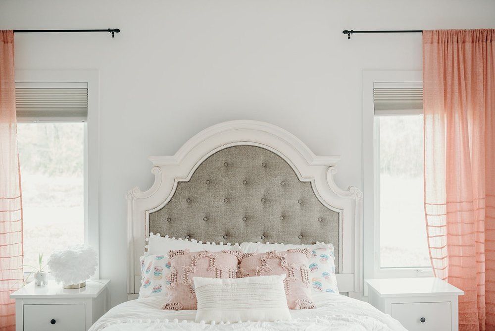 Rug: Liliidae Home & Design / Bed & Bench: The Brick / Knit Throw & Pink Cushions: Urban Barn / Nightstands: Ikea / Light & Macaroon Sheets: Homesense / Curtains: Structube / Bedding: Wayfair