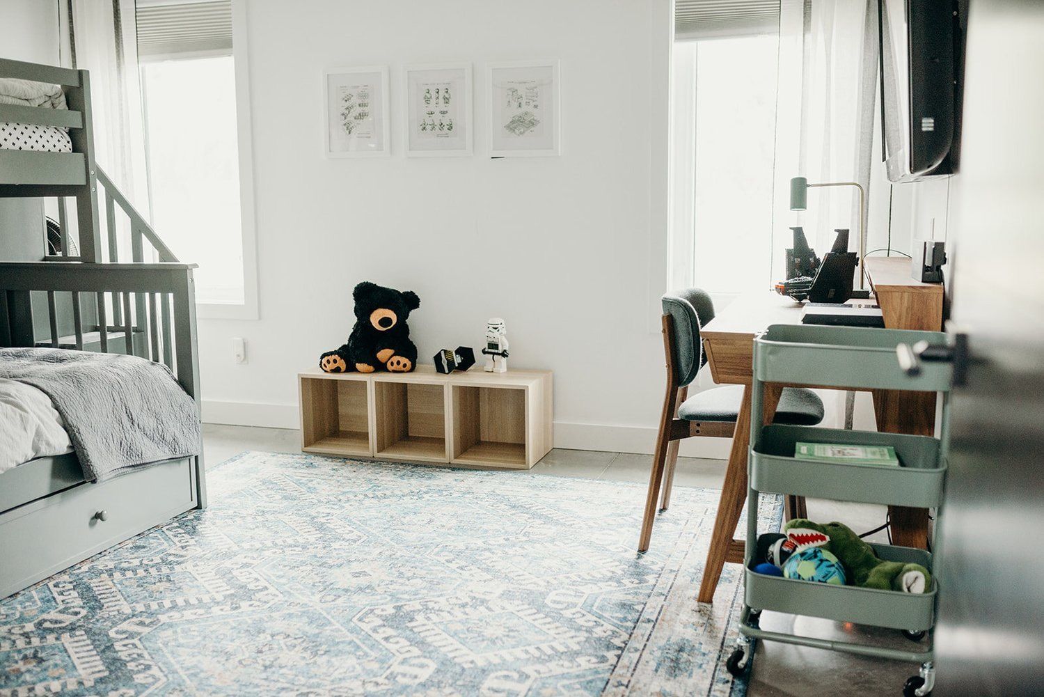 Adding colour and texture is quite easy to do with rugs, bedding, curtains, baskets, and lighting. Printed rugs are great for kid spaces (and high-traffic areas) because they have no pile. Easy to clean, wipe, vacuum, and playing Lego on. I love using baskets in kids room’s because they’re a great solution for storage, give quick and easy access to toys, and they make clean-up a breeze.
