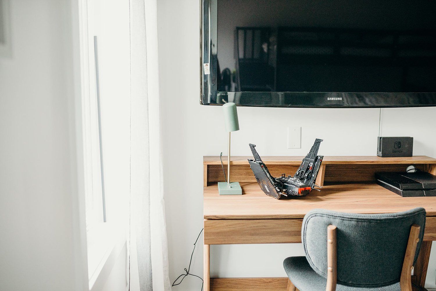 Bed: Wayfair / Rug: Liliidae Home & Design / Lego Prints: Etsy printed from Ultratech Printing / Desk & Chair & Curtains: Structube / Green Cart & Storage Bench: Ikea / Light: Homesense