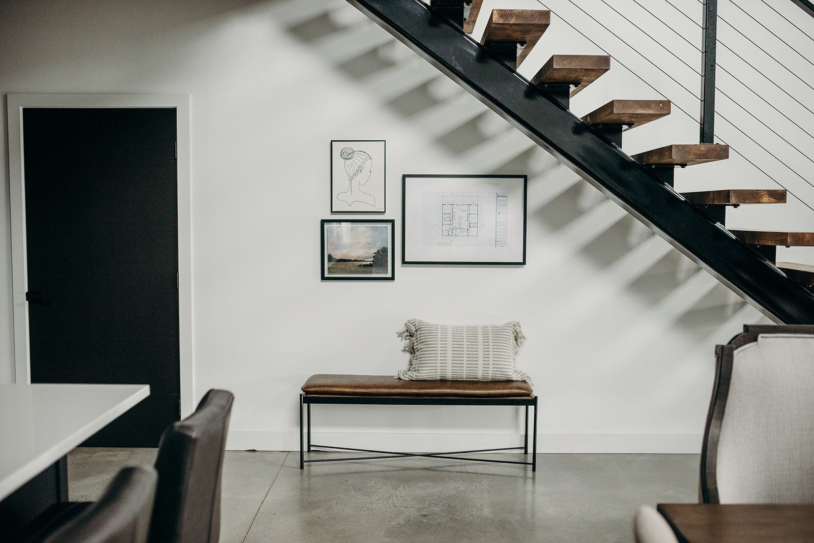 I really love the opportunity to showcase art pieces that hold meaning for the family I am working with. That was the intent with the trio under the staircase (above). The home’s blueprint, a ballerina, and the field landscape all seemed to fit so well with their life.