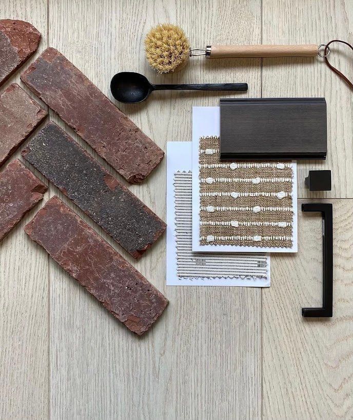 👉 Other details: Adding a metal bar on the wall by the stove means you can hang your pots and pans there and free up precious cabinet space. Stacking your cutting boards on the counter (if they're nice) could be another way to free up cabinet space. This could be done in one of the corners which is deeper and tends to end up as "dead space" anyway. Adding a small plant with them makes it feel more like a design moment rather than just stuff sitting in the corner. We hung a cafe curtain in the window which does a few things for the space: get's a softer and more personalized look, gives privacy, and allows the light from the window to bounce off all the light surfaces in the room and makes it feel more spacious and inviting.