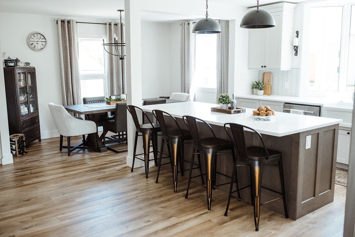 I personally have laminate floors in my home, and I love them! One of the downfalls of my lighter laminate is, that if you drop something on the floor, the surface chips off and reveals the darker core underneath (When I say “you” I mostly mean my four children who now all use the kitchen, cutting their apples, emptying the dish washer, setting the table, and doing all those chores that give plenty of opportunity for sharp objects to be dropped). My floors are the older version and do swell when it gets wet. I seal the chips with a colour matched nail polish, but in the kitchen area it has for sure taken a beating! Laminate can also be a bit slippery -the vinyl floors on the other hand are not at all!